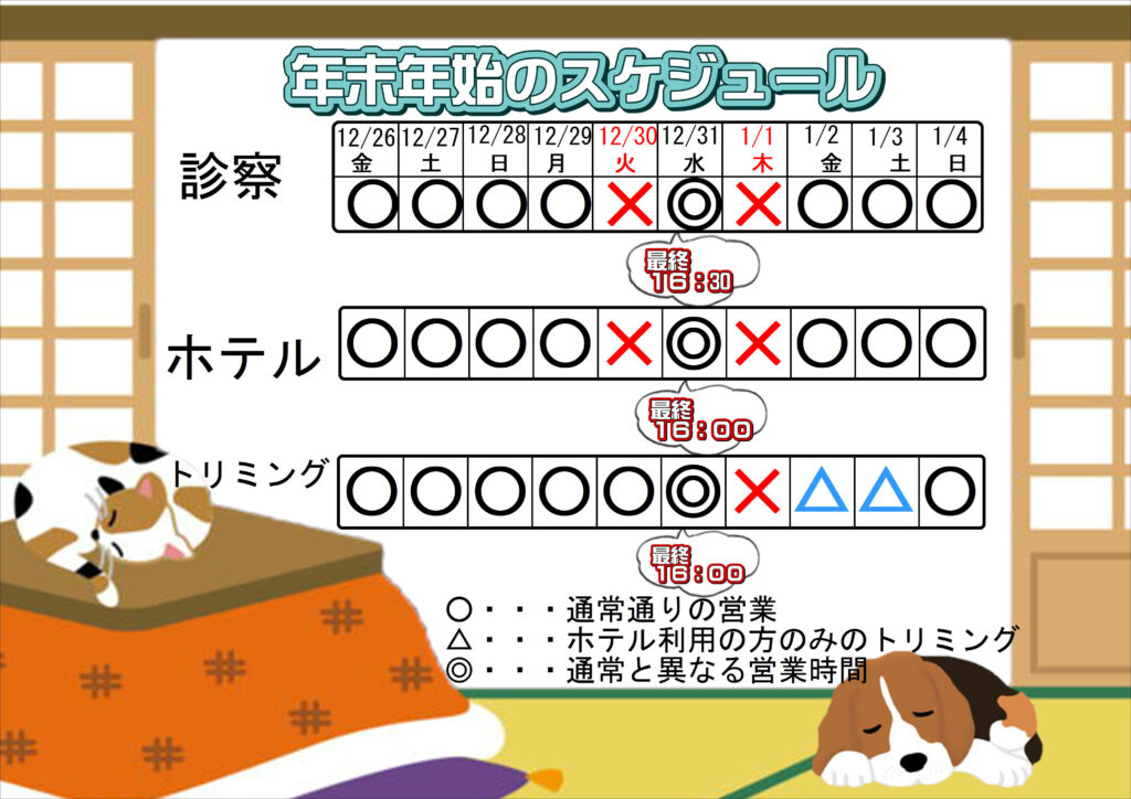 年末年始はホテル、トリミングともに大変混み合います!ぜひお早めにご予約ください。